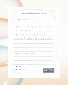 ずっと悩まれていた肩こりが通い出してからとっても楽になったと嬉しいお声を頂きました♪