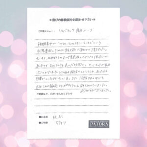 こんにちは!パトラ梅田店です! 本日はうれしいお客様のお声のご紹介です(^^) いつもご来店していただいて、こんなにうれしいお声までうれしい限りです!!! これからも、悩みを改善するために一生懸命お手伝いさせていただきますので、よろしくお願いいたします(^^)