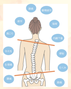 元々、人間の身体は左右非対称なので歪んでいることが普通なのですが、放っておくと肩こりやしびれ、疲労感など身体の不調に繋がる恐れがあります。