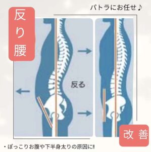 反り腰による不調はたくさん!! ・ぽっこりお腹 ・下半身太り ・巻き肩 ・腹痛・肩こり ・自律神経の乱れ ・内臓の動きの乱れ パトラでは、歪みを見極め、ボディラインを整えます 歪みが解消されるとリバウンドにしくい、美しいボディラインへ!!✨