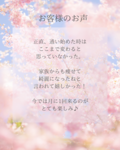 ここまで痩せると思ってなかったと毎回ケアに来るたびに驚きと喜びをお話してくださいます。