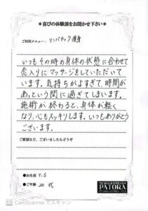 「いつもその時の身体の状態に合わせて念入りにマッサージしていただいています。気持ちがよすぎて時間があっという間に過ぎてしまいます。施術が終わると身体が軽くなり、心もスッキリします。」