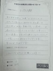 本日はリンパテック痩身でお通いのお客様から