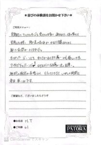 定期的にリンパマッサージで通ってくださっている61歳のお客様から嬉しいお声をいただきました!